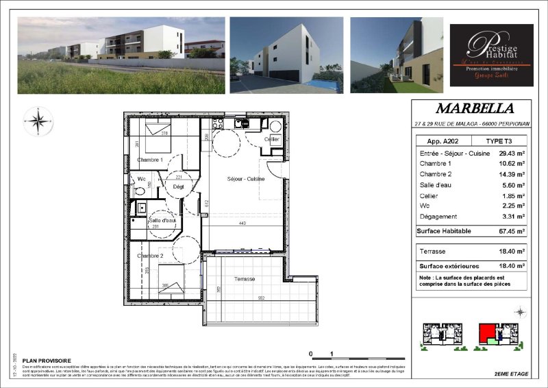 Bel appartement T3 de 60.04 m2 avec une terrasse de 10.07 m2 et une place de parking privatif. Il comprends un dégagement , une entrée , un séjour...