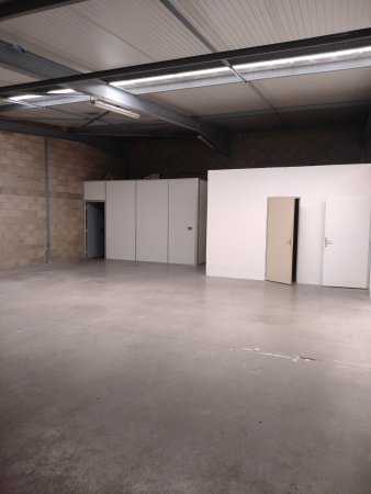 Entrepôt avec porte sectionnelle garage + une mezzanine et un bureau d'environ 15m² le tout avec un espace extérieur clôturé et fermé par portail....