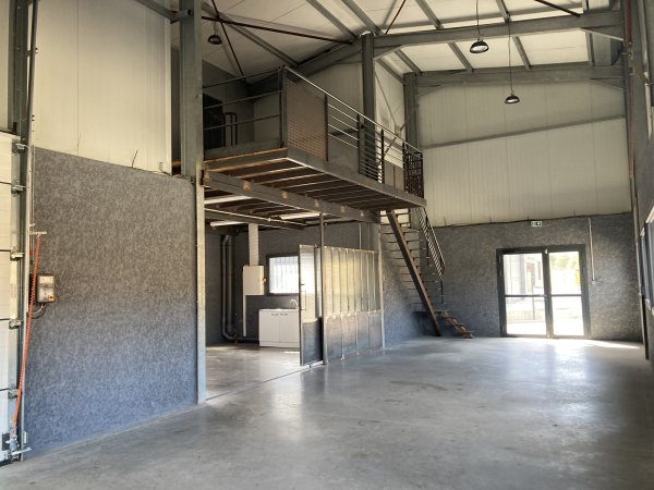 Entrepôt avec porte sectionnelle garage + une mezzanine et un bureau d'environ 15m² le tout avec un espace extérieur clôturé et fermé par portail....