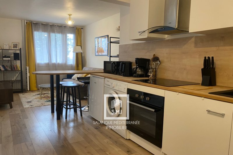 Appartement T2 loué meublé et situé au 1er étage avec ascenseur, il se compose d'une entrée, d'une salle de bains avec WC, d'un salon séjour avec cuisine ouverte équipée et d'une chambre avec rangement.