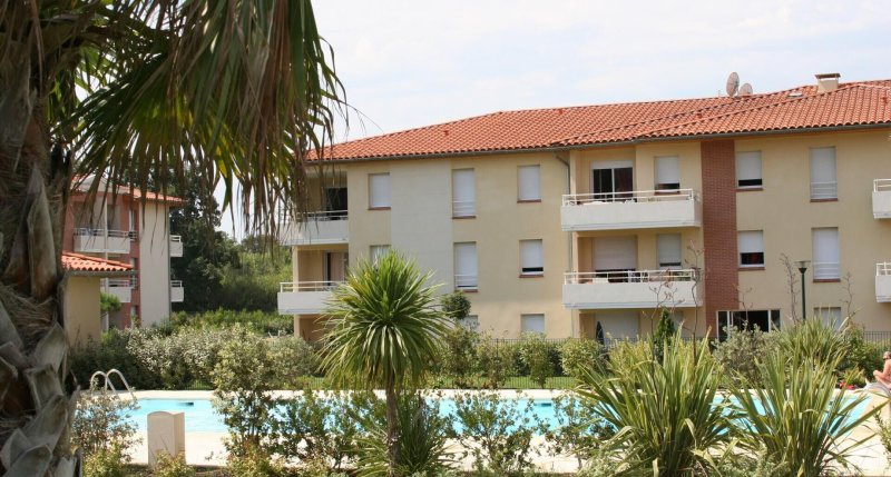 Les Terrasses du Sud, T2 situé au 1er étage d'une résidence avec piscine, gardien et espaces verts, comprenant une cuisine équipée ouverte sur séjour, 1 chambre avec placard, 1 salle de bain aménagée avec vasque, meuble et baignoire, WC séparés. L'appartement dispose d'un balcon et d'une place de parking.