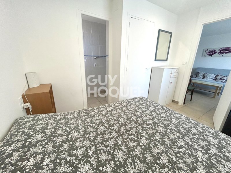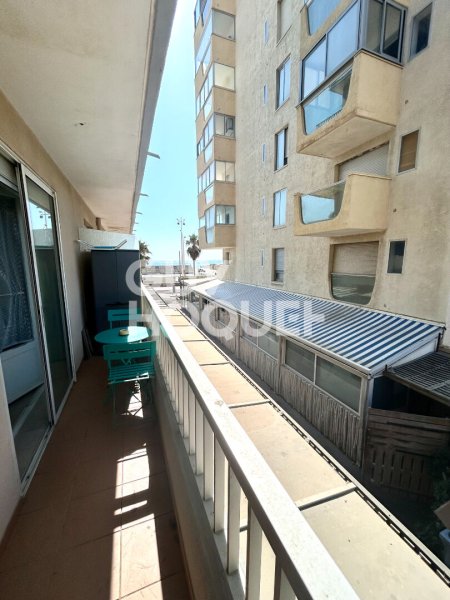 Joli T2, au 1er étage d'une résidence face à la mer, composé d'un salon/séjour desservant une cuisine aménagée et équipée, une chambre et une salle d'eau et un WC.