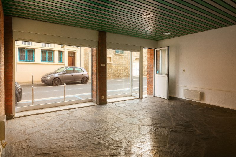 Local commercial ou professionnel de 60 m², traversant et bénéficiant d'une double entrée avec vitrines. L'accès principal se fait par l'avenue, donnant sur une vitrine pleine hauteur et une première pièce ouverte comprenant un bureau semi-ouvert. Un dégagement mène aux WC séparés.