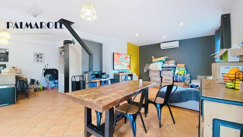 Au rez de chaussée: vaste séjour climatisé et équipé d'un poêle à bois, ouvert sur une cuisine aménagée semi équipée.
