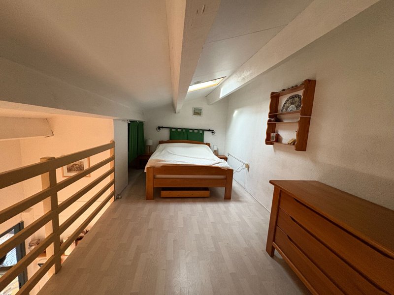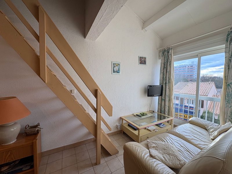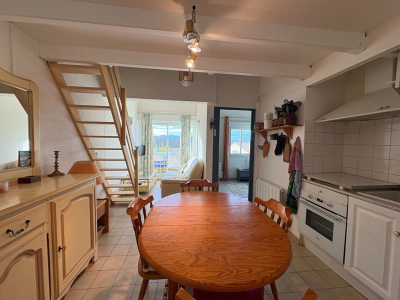 Situé à 200 mètres de la plage, au 2ème étage d'une copropriété, cet appartement vendu meublé dispose d'une pièce à vivre avec salle à manger, cuisine, coin salon.