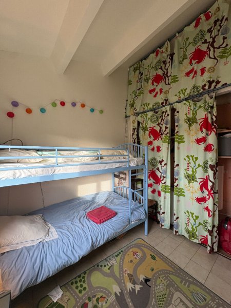 Une chambre avec lit superposé et beaucoup de rangements sur toute la hauteur, une salle d'eau avec wc et une deuxième pièce en mezzanine avec lit double.