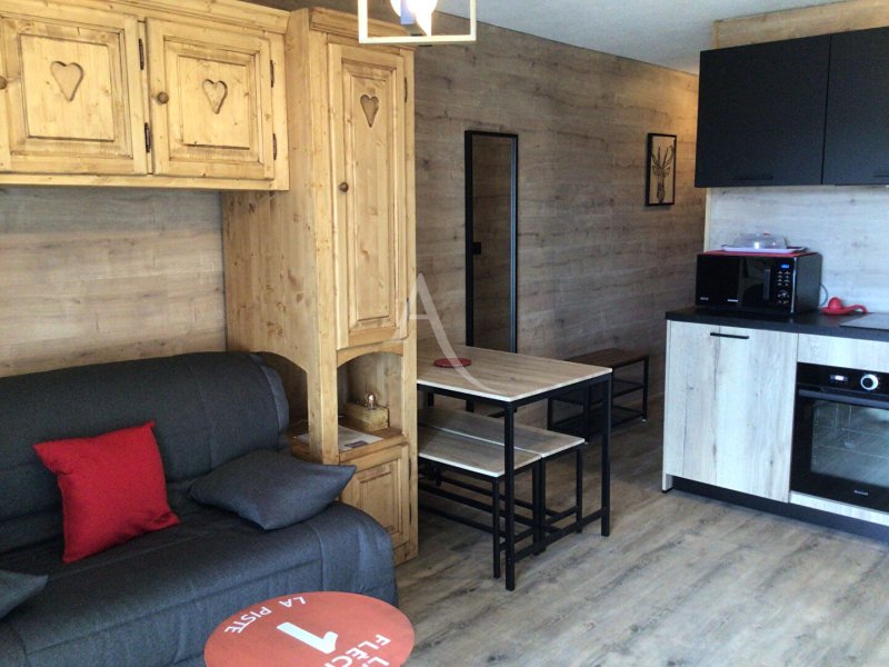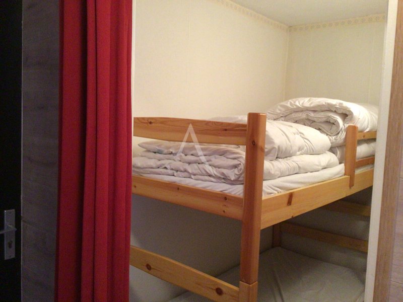 Studio cabine rénové avec goût (meuble de qualité) au 1er étage d'une résidence située à proximité d'un arrêt navette. Il est composé d'une entrée desservant une cabine (2 lits superposés), une salle d'eau/WC (placard), séjour ouvrant sur un balcon vue lac et montagne, coin cuisine très bien équipé.