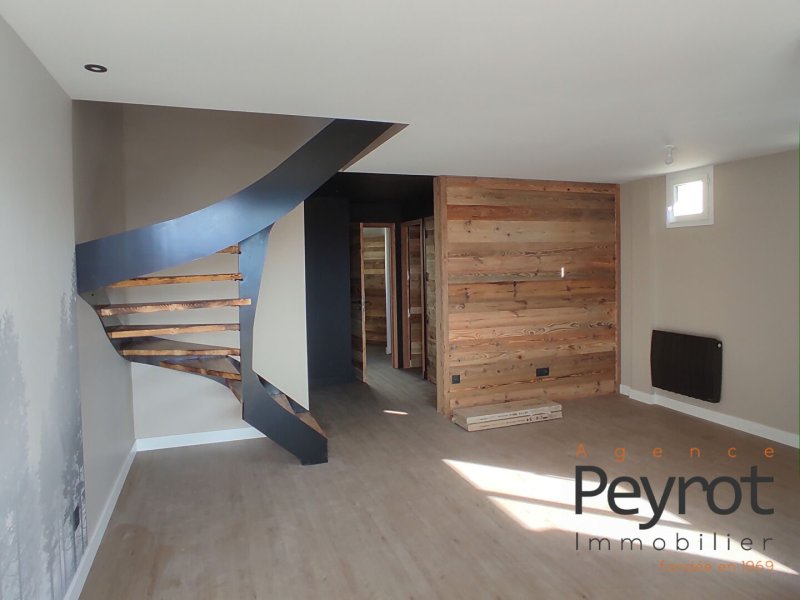 APPARTEMENT DE TYPE 5 EN DUPLEX entièrement rénové composé en RDC d'un très grand séjour cuisine salon donnant sur un balcon avec vue village, montagnes et lac. D'une chambre avec placards et salle d'eau, d'un WC et d'une buanderie. A l'étage deux chambres avec rangements, une salle d'eau WC et une chambre sous pente avec rangements en profondeur. Centre du village, parking privatif. Honoraires à la charge du vendeur. Classe énergie D, Classe climat B Montant estimé des dépenses annuelles d'énergie pour un usage standard : entre 1377.00 et 1863.00 sur les années 2021, 2022 et 2023 (abonnements compris). Les informations sur les risques auxquels ce bien est exposé sont disponibles sur le site Géorisques : georisques.gouv.fr.