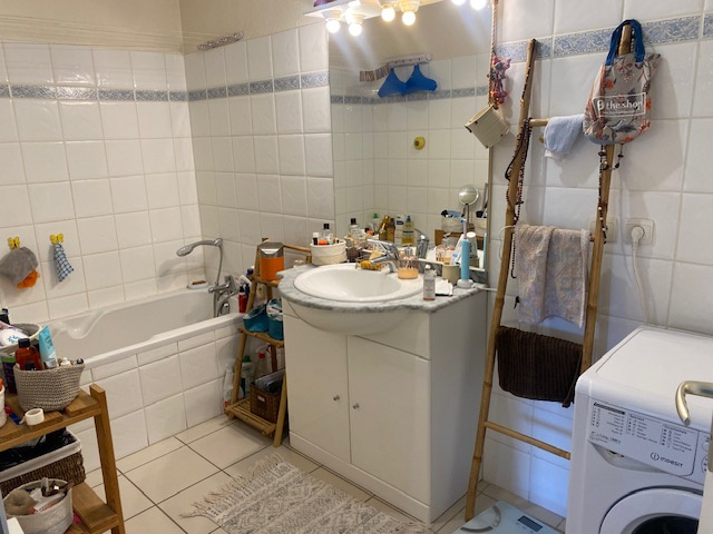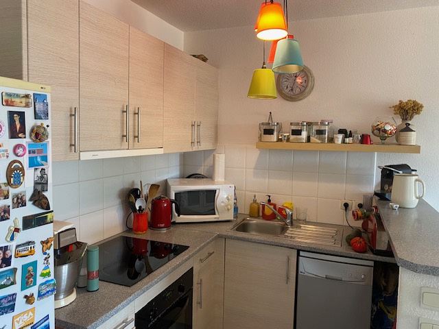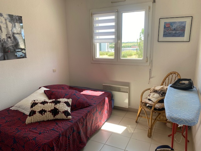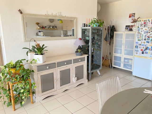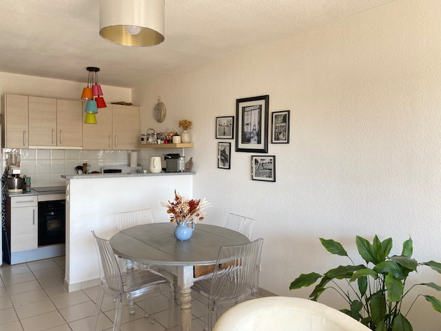 QUARTIER SAINT GAUDERIQUE A PERPIGNAN: proche toutes commodités, au 1er et dernier étage d'une petite copropriété. Bel appartement F3 dans un environnement privilégié, comprenant: une entrée avec rangements, séjour/cuisine ouverte climatisé avec terrasse jolie vue dégagée sur les Albères, 2 chambres avec placards aménagés, SDB, WC séparés. Le logement est loué à l'année, loyer 714EUR et prov. charges 55EUR. Un garage individuel vient compléter le lot principal