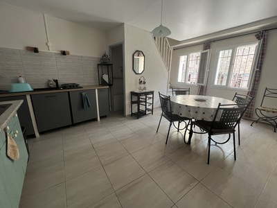 Il se compose en rez-de-chaussée d'une cuisine aménagée ouverte sur la salle à manger et d'un petit rangement sous escalier.