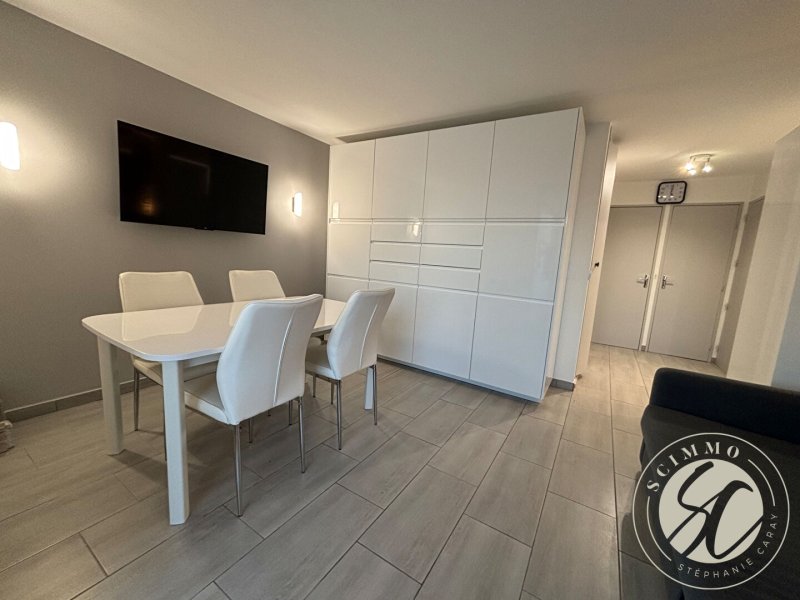 Il comprend un séjour - salle à manger, une cuisine moderne équipée, une loggia fermée avec superbe vue, une chambre avec lit parental et une chambre cabine avec lits superposés, une salle d'eau, un toilette séparé. Parking privatif. Résidence sécurisée avec piscine située à deux pas du Centre commercial des Capellans.