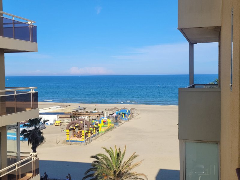 Canet Plage T2 d'angle avec vue latérale mer dans une résidence en front de mer entre le centre et port. Séjour et cuisine équipée donnant sur loggia fermée de 7 m², une chambre avec placard, salle avec douche italienne et fenêtre, wc. Meublé. Coup coeur assuré.