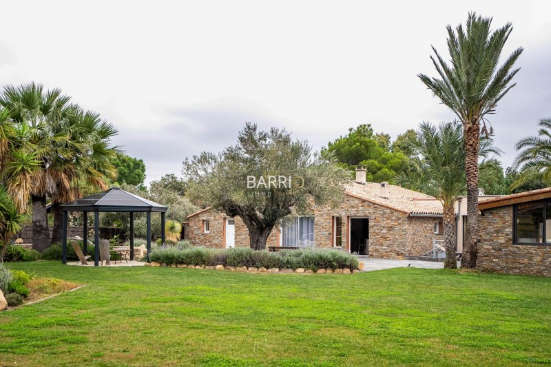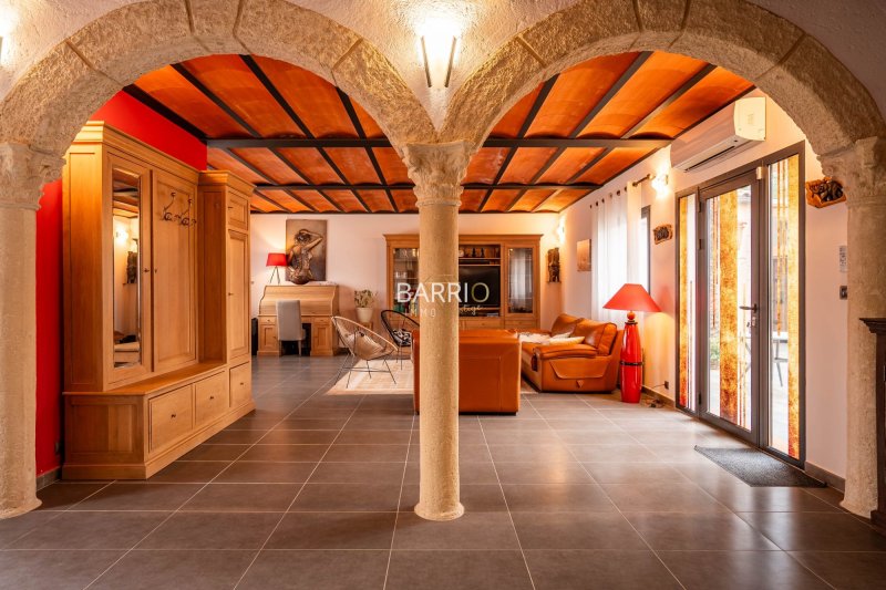 Dans un secteur résidentiel calme et boisé, cette propriété d'exception dévoile un cadre de vie rare, entre nature, confort et élégance. Dès l'arrivée, un grand portail automatisé s'ouvre sur un large espace de stationnement pouvant accueillir de nombreux véhicules. Les garages et annexes fermés offrent sécurité et praticité, tandis que le parc paysager, méticuleusement entretenu, invite immédiatement à la quiétude. Sur plus de 6 000 m² de terrain, les extérieurs sont une véritable oeuvre vivante : allées bordées d'oliviers et de palmiers majestueux, massifs fleuris, étang orné d'une cascade, et une piscine carrelée avec plage immergée se fondant dans la végétation méditerranéenne. Un espace cuisine d'été entièrement équipée permet de recevoir en toute convivialité, tandis qu'une élégante pergola, un peu à l'écart, crée un coin détente parfait face à la vue panoramique sur la chaîne des Albères. Un espace pour chevaux et une loge indépendante de deux chambres complètent harmonieusement cet environnement d'exception. La villa, de plain-pied et climatisée, ne nécessite aucun travaux. Elle se distingue par son style architectural élégant, ponctué d'arches et de voûtes, qui apportent une atmosphère chaleureuse et intemporelle. Le vaste séjour s'ouvre sur les terrasses, la cuisine est moderne et fonctionnelle, et la salle de bain balnéo, équipée d'une douche à l'italienne et d'une baignoire, promet des instants de détente absolue. Une adresse confidentielle, rare sur le marché, où chaque détail a été pensé pour conjuguer prestige, nature et sérénité. Une signature Barrio Prestige pour les amoureux du beau et du paisible. Honoraires inclus de 4.74% TTC à la charge de l'acquéreur. Prix hors honoraires 950 000 . Classe énergie C, Classe climat A Montant estimé des dépenses annuelles d'énergie pour un usage standard : entre 1330.00 et 1880.00 sur les années 2021, 2022 et 2023 (abonnements compris). Les informations sur les risques auxquels ce bien est exposé sont disponibles sur le site Géorisques : georisques.gouv.fr.