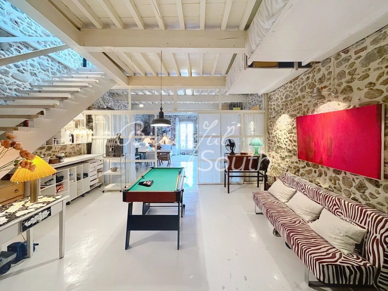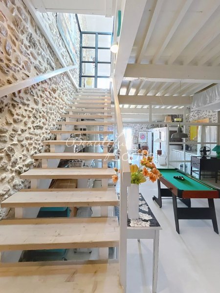 À l’étage, une grande pièce de vie de style loft new-yorkais réunit cuisine équipée, espace repas et espace nuit, ainsi qu’une salle d’eau avec WC. L’accès direct à la terrasse favorise une belle continuité intérieur/extérieur, et l’agencement permettrait facilement de créer des espaces plus distincts.