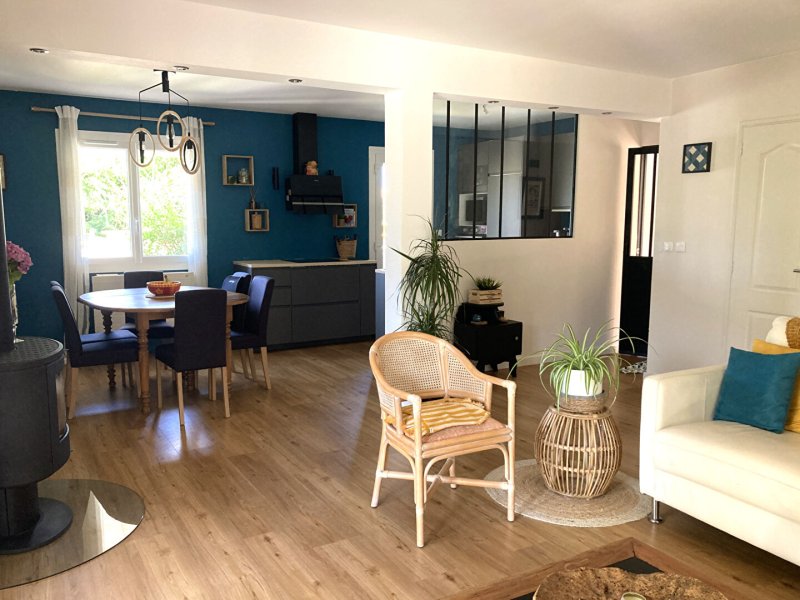 De plain pied, une belle pièce de vie climatisée avec cuisine équipée entièrement neuve, cellier, bureau avec entrée indépendante et toilettes séparés.