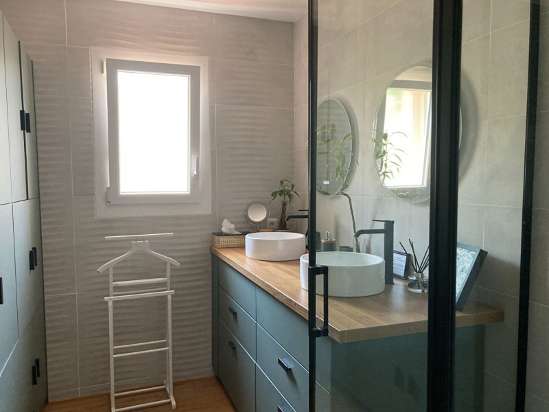 A l'étage 3 belles chambres climatisées, dont une avec dressing, salle d'eau neuve avec douche à l'italienne, double vasques, grand placard de rangement et wc séparé.