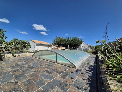 Coté extérieur, le bien dispose d'une piscine couverte avec douche solaire, d'un abri de jardin de 27 m² et d'un garage avec porte motorisé accessible depuis la maison.