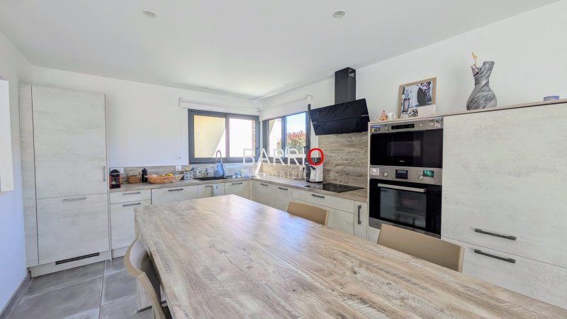 Dans un quartier prisé de Laroque-des-Albères, découvrez cette villa contemporaine de plus de 120 m², construite en 2019. Un bien alliant confort et modernité, avec sa grande pièce de vie baignée de lumière, composée d'un salon avec poêle à bois, d'une salle à manger et d'une cuisine américaine entièrement équipée. Le tout s'ouvrant sur une belle terrasse exposée sud. La suite parentale de plain-pied, avec salle d'eau et dressing, assure un confort de vie optimal. Un cellier ainsi qu'un WC indépendant complètent ce niveau. À l'étage, deux chambres lumineuses, offrant une jolie vue, se partagent une salle de bains avec WC. À l'extérieur, une terrasse ensoleillée s'intègre harmonieusement au coeur d'un jardin soigneusement aménagé et arboré, offrant un espace idéal pour profiter pleinement du climat méditerranéen en toute sérénité. Le bien dispose également d'un garage indépendant ainsi que de plusieurs places de stationnement privatives. Aucun travaux à prévoir pour un bien rare, climatisé, avec panneaux solaires, implanté dans un environnement privilégié. A découvrir sans tarder. Honoraires inclus de 3.66% TTC à la charge de l'acquéreur. Prix hors honoraires 410 000 . Classe énergie A, Classe climat A Montant estimé des dépenses annuelles d'énergie pour un usage standard : entre 330.00 et 480.00 sur les années 2021, 2022 et 2023 (abonnements compris). Les informations sur les risques auxquels ce bien est exposé sont disponibles sur le site Géorisques : georisques.gouv.fr.