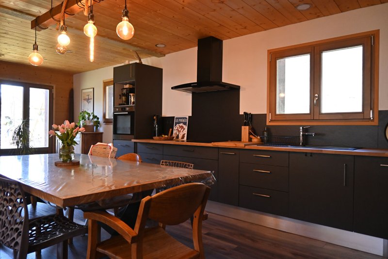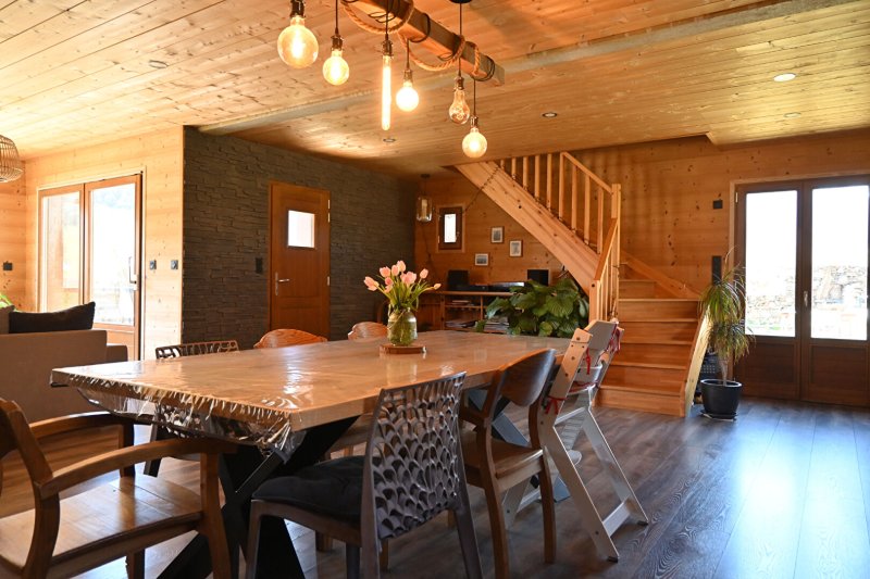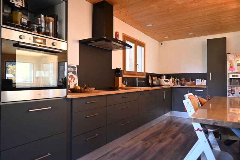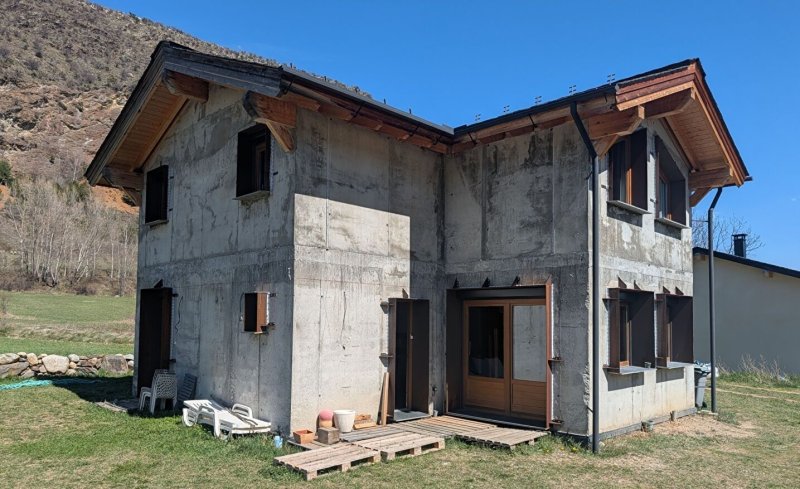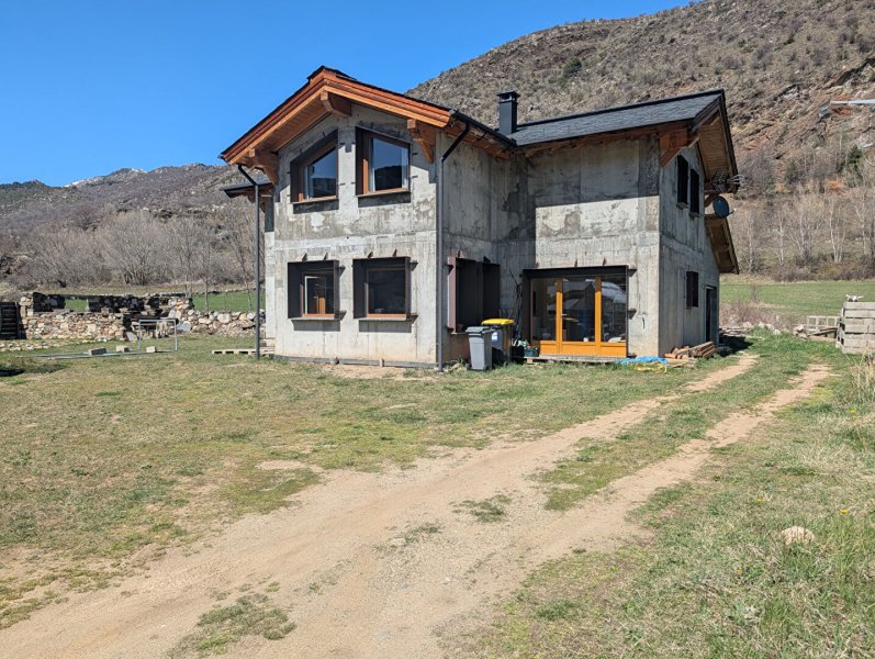 La maison a été conçue pour recevoir des façades en parement pierre en partie basse et un bardage bois sur les hauteurs.