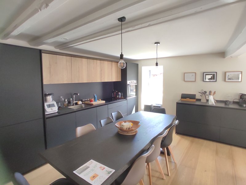 - 1er étage : un grand séjour lumineux avec cuisine ouverte entièrement équipée, donnant accès à une spacieuse terrasse en bois exposée SUD - OUEST, parfaite pour vos repas en extérieur ou moments de détente.