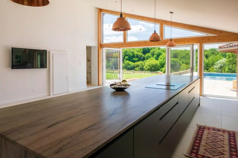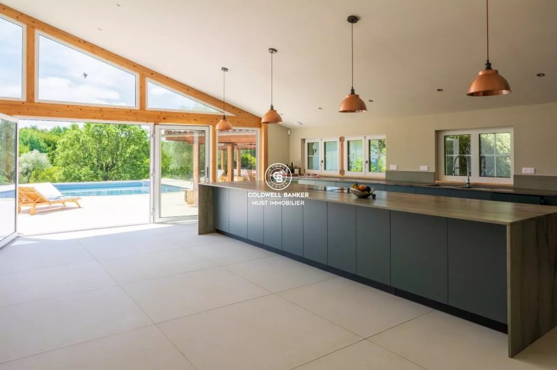 Cuisine entièrement équipée de 60 m², avec vue exceptionnelle sur les lacs du domaine.