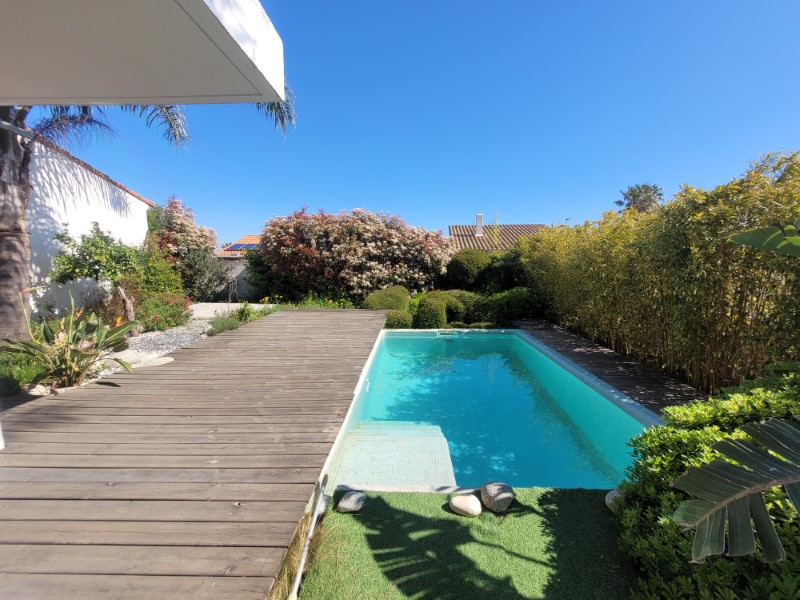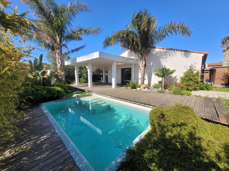 Résidentiel calme, sur 618m2 de jardin paysagé sans vis-à-vis, Villa 4 Faces, de 1999, 102m2 sh composée d'une entrée, séjour-salon-cuisine équipée ouverte 52m2 avec sortie sur le jardin par une large baie vitrée à galandage, 3 chambres, salle d'eau douche à l'italienne, 2 wc. Climatisation dans le séjour et deux chambres, volets roulants. Garage double 34m2 avec porte électrique, atelier. Belle terrasse couverte, Piscine maçonnée, coin barbecue four à pizza. Puits. Belles prestations.