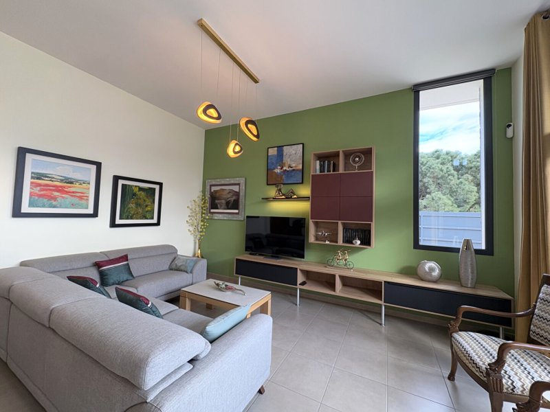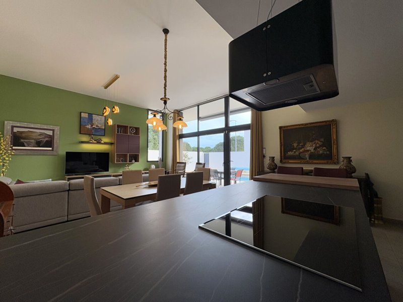 Prestations : fenêtres ALU, climatisation gainable, cuisine Ixina, piscine en travertin au sel auto nettoyante, une place de stationnement.