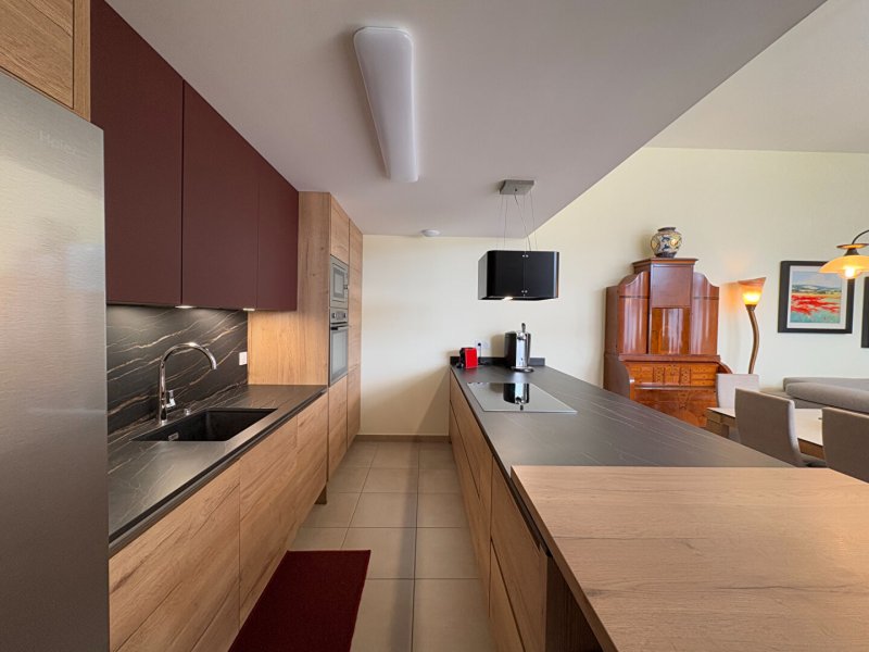La partie cuisine a été conçue autour de la convivialité est reste équipée, tout comme le meuble sur mesure du salon.