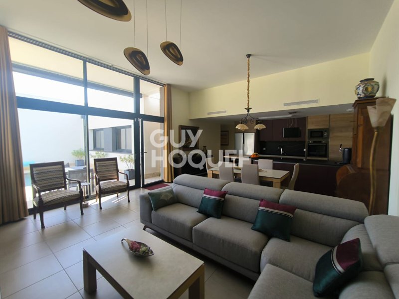Elle est composée d'une belle pièce de vie avec ses belles baies vitrées donnant sur la piscine, sa cuisine moderne, aménagée et équipée, ses 3 chambres dont une suite parentale et de son joli patio, le tout sur un terrain de 236.60 m².