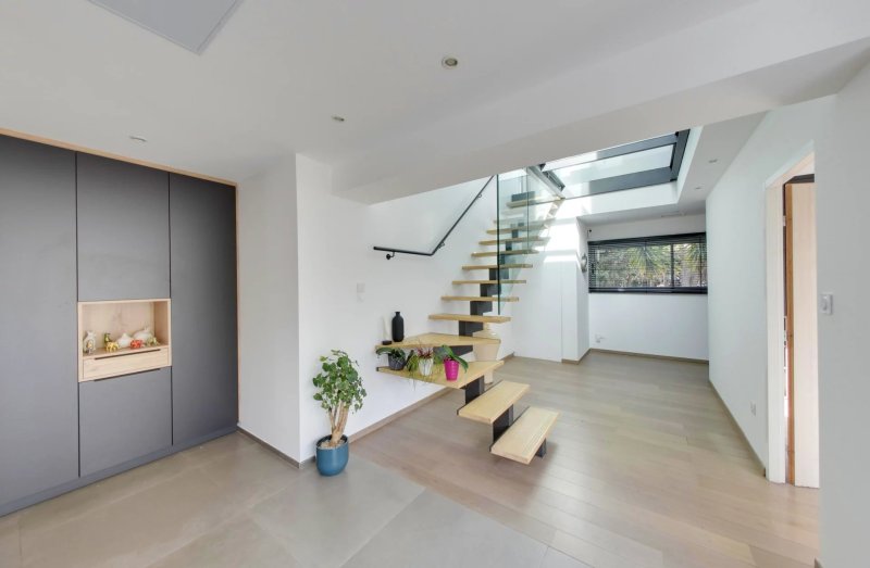 L’habitation propose un vaste espace de vie de 65 m² largement ouvert sur la lumière, trois chambres dont une suite parentale de plain-pied, ainsi qu’une salle de douche complémentaire et un coin bureau.
