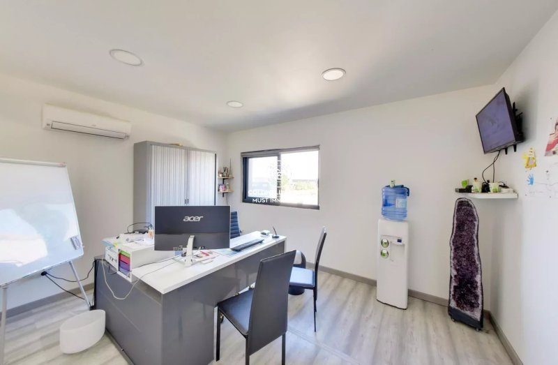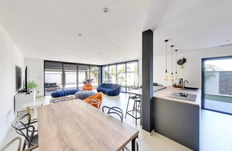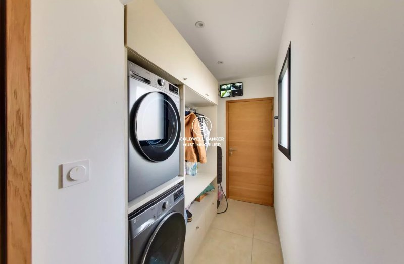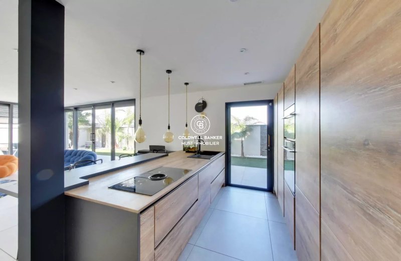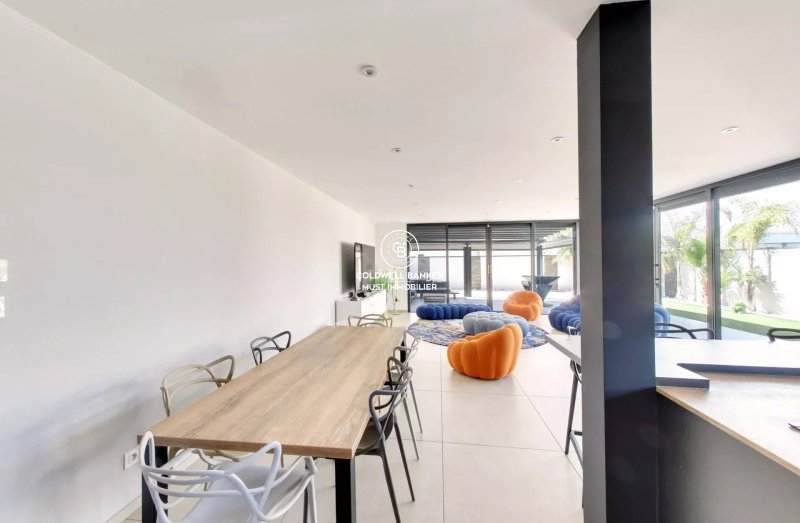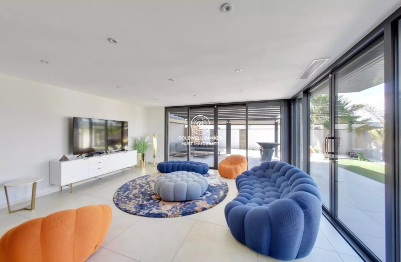 La villa est composée d'un grand hall d'entrée, d'un toilette, d'une vaste pièce de vie vitrée avec cuisine équipée, donnant sur une grande terrasse bioclimatique et sur une seconde terrasse avec BBQ.