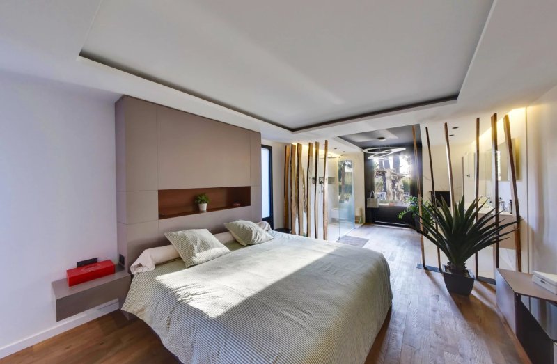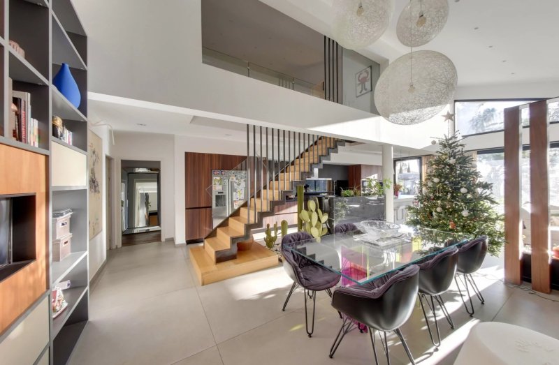 À l’étage, l’espace nuit propose quatre chambres d’environ 14 m², deux salles d’eau, ainsi qu’une mezzanine/palier de 18 m² actuellement aménagée en espace jeux, apportant une circulation fluide et des perspectives ouvertes sur l’architecture intérieure.