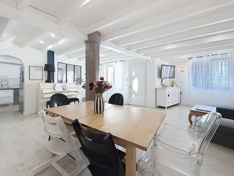 Le rez-de-chaussée propose une pièce à vivre accueillante, composée d'un salon et d'une salle à manger. Une verrière au style atelier ouvre sur une cuisine aménagée et équipée, fonctionnelle et soigneusement intégrée, avec un accès à un agréable extérieur, idéal pour profiter des beaux jours en toute tranquillité.