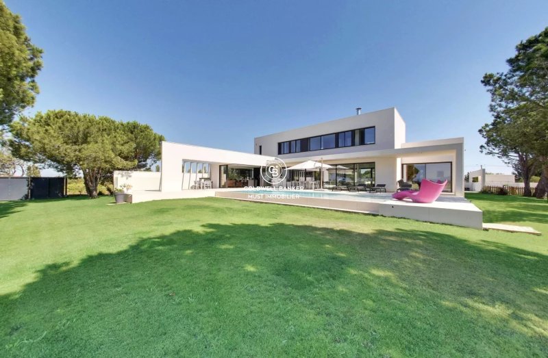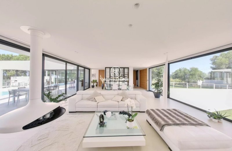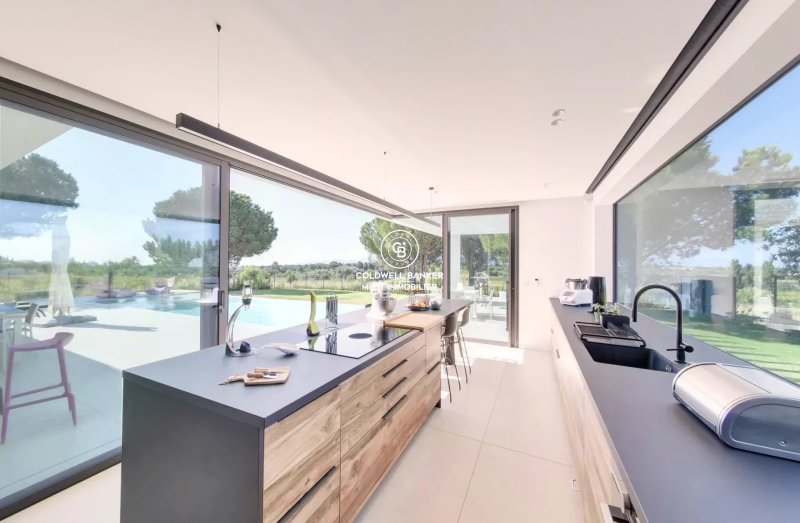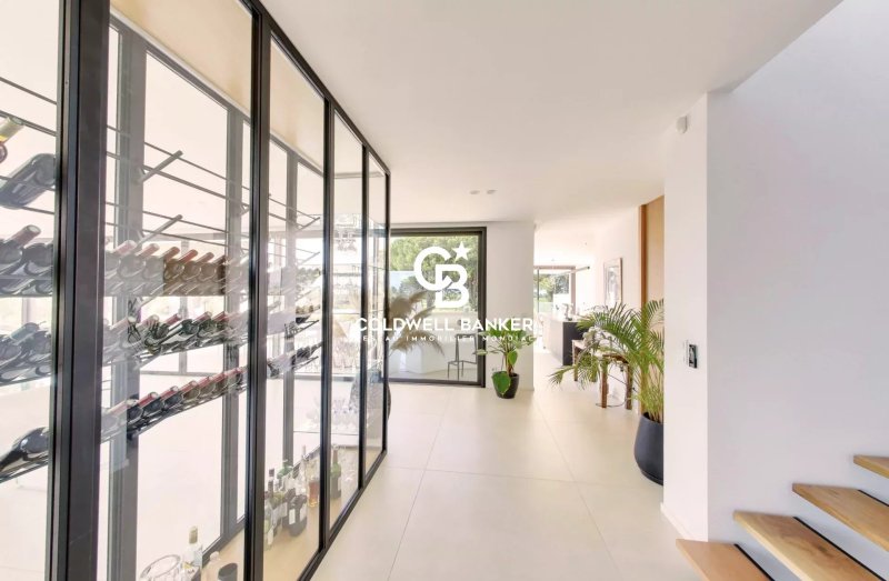 Dès l’entrée, le ton est donné : une élégante cave à vin vient séparer un hall majestueux d’un vaste séjour avec cuisine ouverte de 100 m², le tout largement ouvert sur les terrasses, le jardin paysager et sa piscine à débordement.