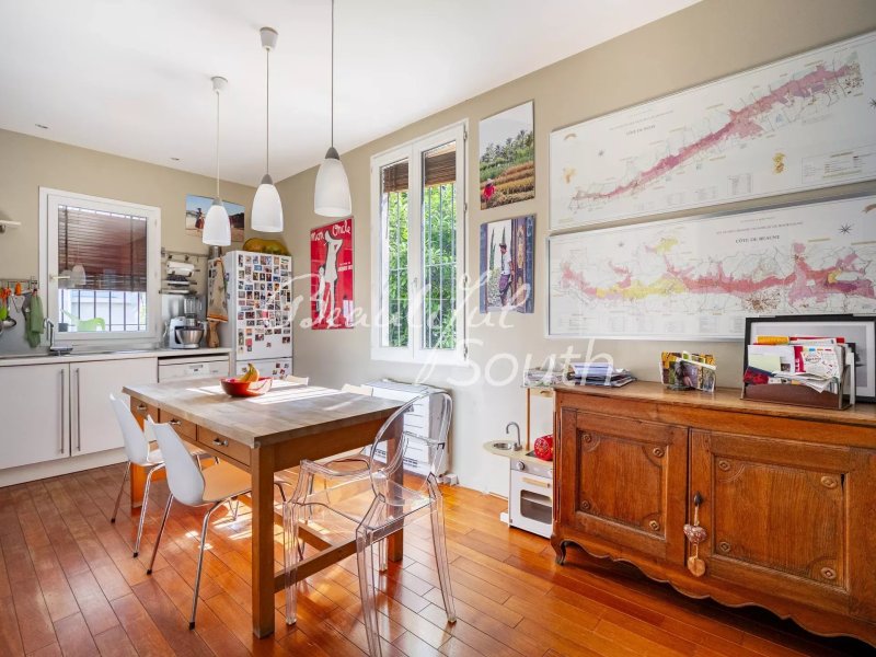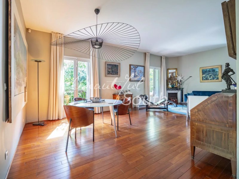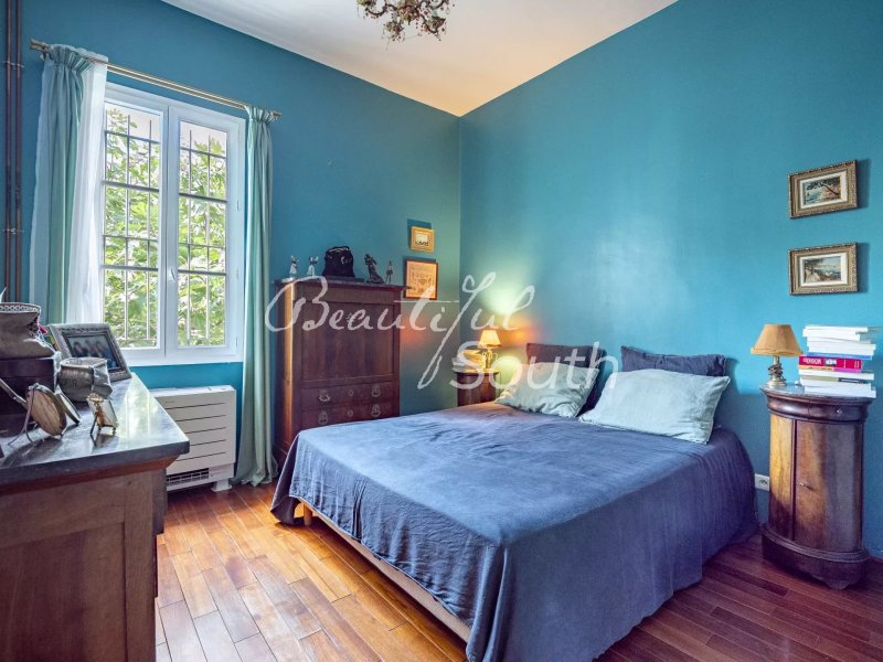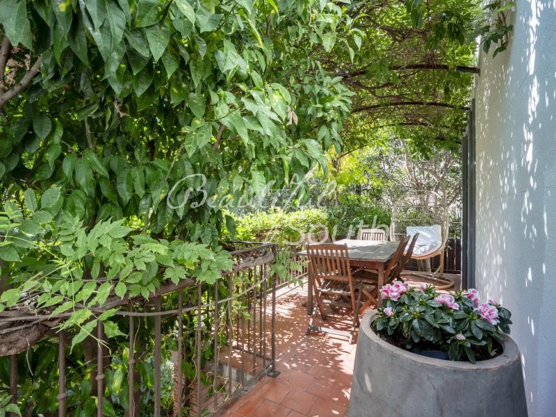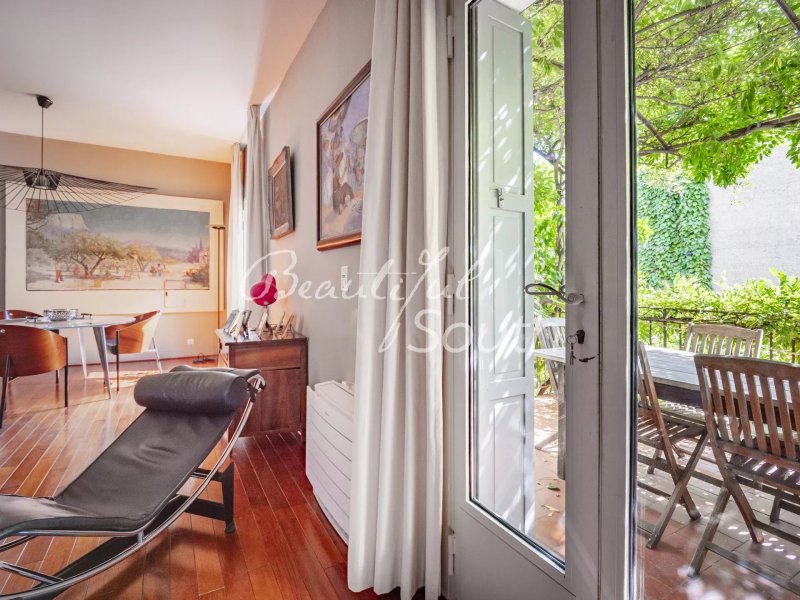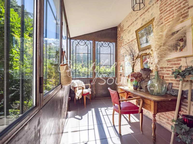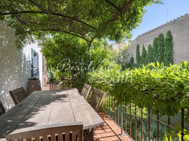 Dès l'entrée, un portail discret s’ouvre sur un magnifique jardin arboré exposé plein sud, véritable havre de paix en pleine ville. Un escalier d’époque, bordé d’un balcon filant et d’une terrasse ombragée par une glycine luxuriante, mène à une superbe véranda en fer forgé sur mesure qui constitue l’entrée principale.
