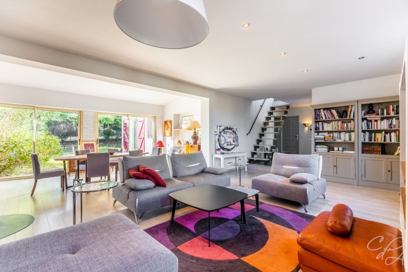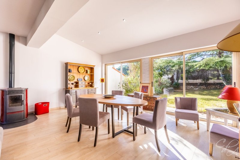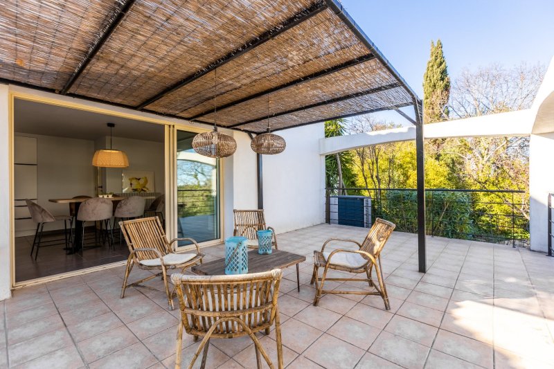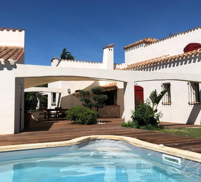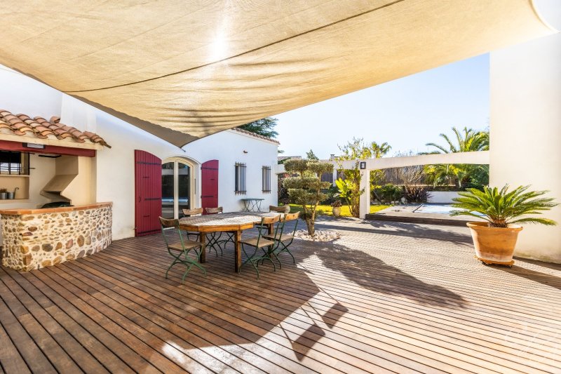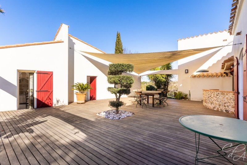 Bâtie sur la partie haute d'une parcelle de 2500 m² joliment arborée et ponctuée de terrasses différemment exposées qu'agrémente une piscine, composée d'une villa et d'un pavillon annexe s'articulant l'une et l'autre autour d'un vaste patio central où il fait bon se retrouver, cette maison a été conçue par des propriétaires soucieux de se ménager une jolie vue, de se protéger de la tramontane et de profiter pleinement des extérieurs, sitôt que le soleil darde ses premiers rayons. Pourvue de 6 chambres et d'un confortable séjour, équipée d'une pompe à chaleur, d'un poêle et d'une climatisation réversible, elle est la maison à vivre par excellence.