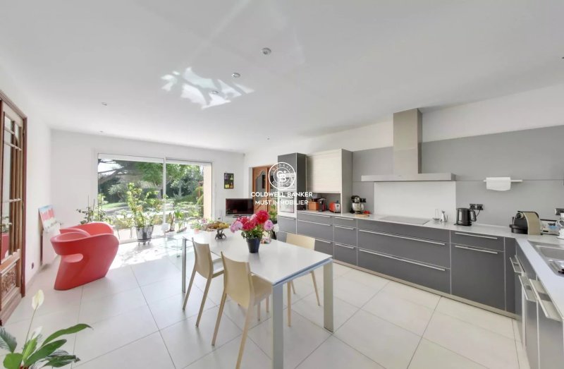 La cuisine haut de gamme de 35m², séparée, s’ouvre sur les terrasses et le magnifique jardin arboré.