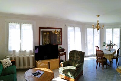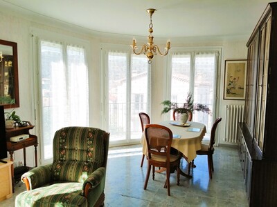 Puis au 1er étage, un dégagement donnant accès à la cuisine indépendante avec cellier, d'une séjour/salon avec de nombreuses fenêtres donnant accès au balcon avec vue dégagée, 2 chambres (dont 1 avec une loggia), une salle de bain + douche, wc séparé.