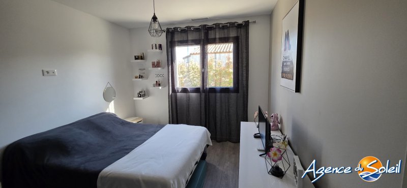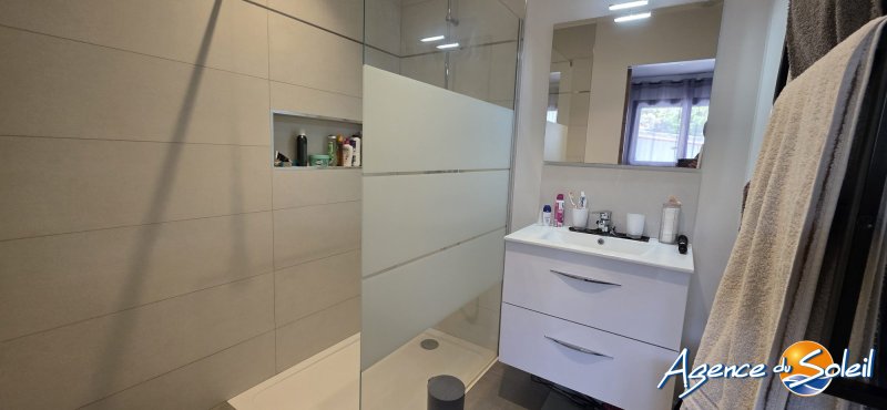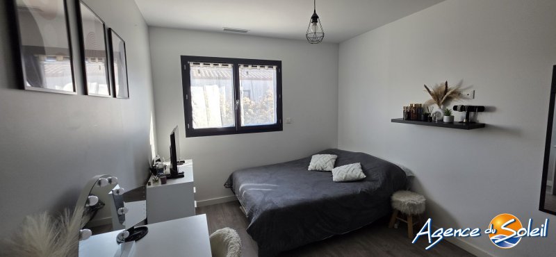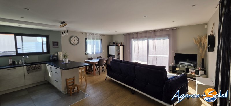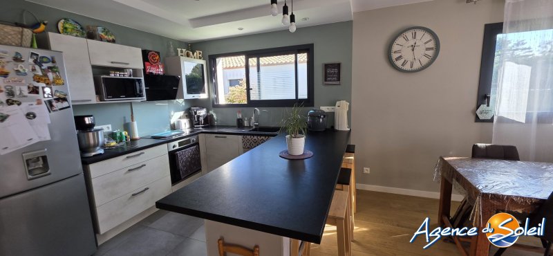Au sein d'un environnement résidentiel et calme, posée sur une jolie parcelle de terrain de 497m2 exposée Sud-Ouest, très jolie Villa à l'esprit contemporain de Plain Pied de 100,18m2 offrant un hall d'entrée, un spacieux séjour-salle à manger-cuisine us le tout baigné de luminosité, 3 chambres dont une suite parentale avec sa salle d'eau privative, une salle de bains, un wc indépendant, une buanderie avec espace de rangements, un grand garage carrelé avec fenêtre et porte sectionnelle. La maison dispose également d'une terrasse couverte et d'une autre extérieure avec store banne électrique, cuisine d'été avec son espace barbecue et un bel espace jacuzzi. Possibilité de stationner plusieurs véhicules ou camping-car en toute sécurité. Climatisation réversible gainable, environnement des plus agréables. Une maison parfaitement tenue et entretenue Toutes informations à l'Agence. Votre contact Olivier au 06.82.41.03.98 Honoraires à la charge du vendeur. Classe énergie A, Classe climat A Montant moyen estimé des dépenses annuelles d'énergie pour un usage standard, établi à partir des prix de l'énergie de l'année 2023 : entre 430.00 et 640.00 . Les informations sur les risques auxquels ce bien est exposé sont disponibles sur le site Géorisques : georisques.gouv.fr. . Retrouvez tous nos biens sur www.agencedusoleil.com