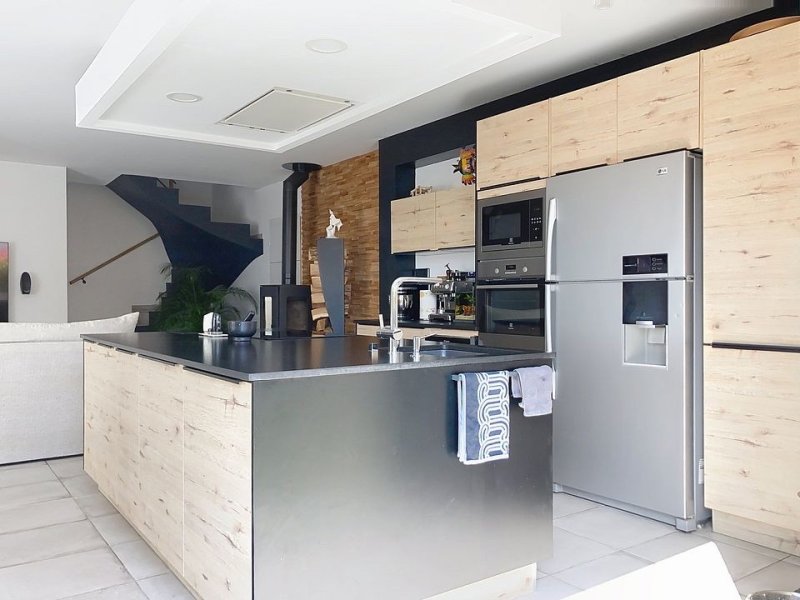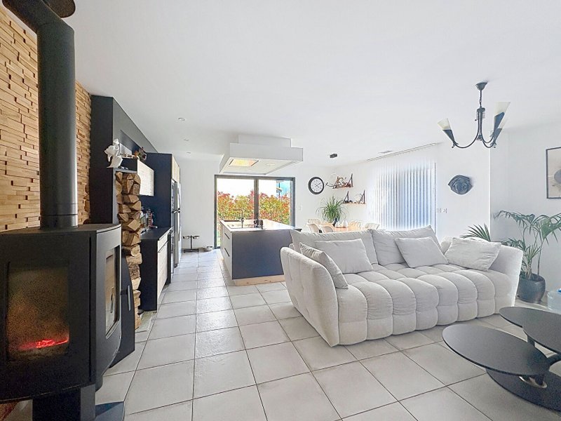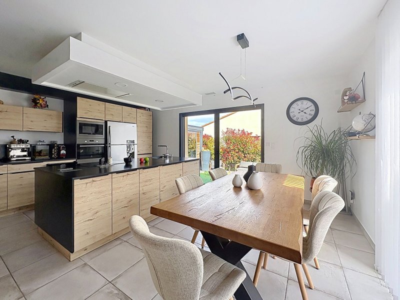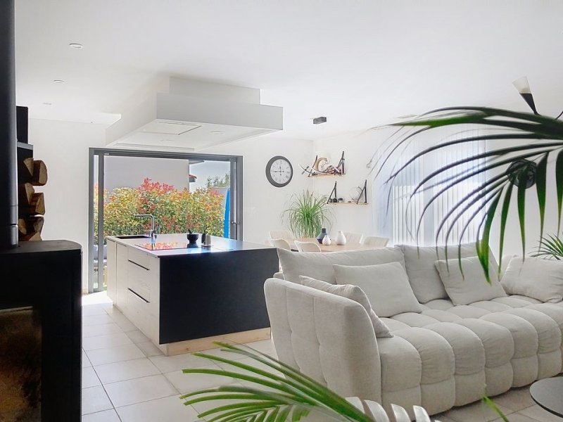 Une pièce de vie de 41 m, avec une cuisine américaine avec un accès à la terrasse et piscine à l'arrière.