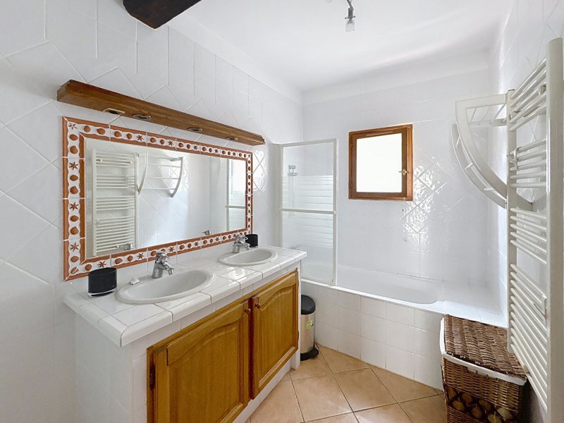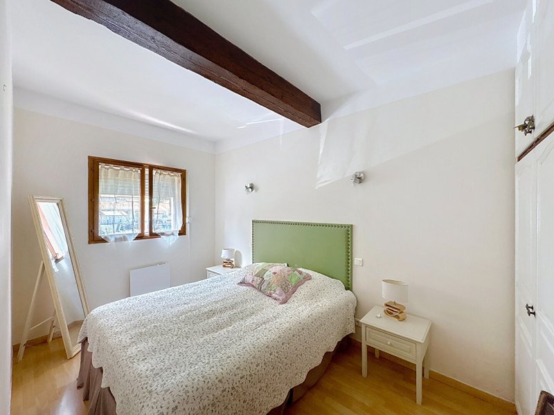 Au rez-de-chaussée, vous trouverez deux chambres dont une avec placard et de belles poutres apparentes, une salle de bains avec douche et baignoire, ainsi qu'un WC séparé.