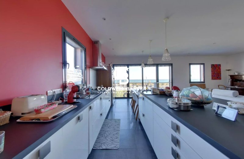 À l’étage, la vaste pièce de vie révèle tout son caractère : baignée de lumière, ouverte sur l’horizon, elle encadre la mer grâce à une large baie vitrée transformée en tableau naturel. La terrasse vient poursuivre l’espace et le poêle à bois y ajoute une ambiance chaleureuse. Une suite occupe aussi ce niveau.