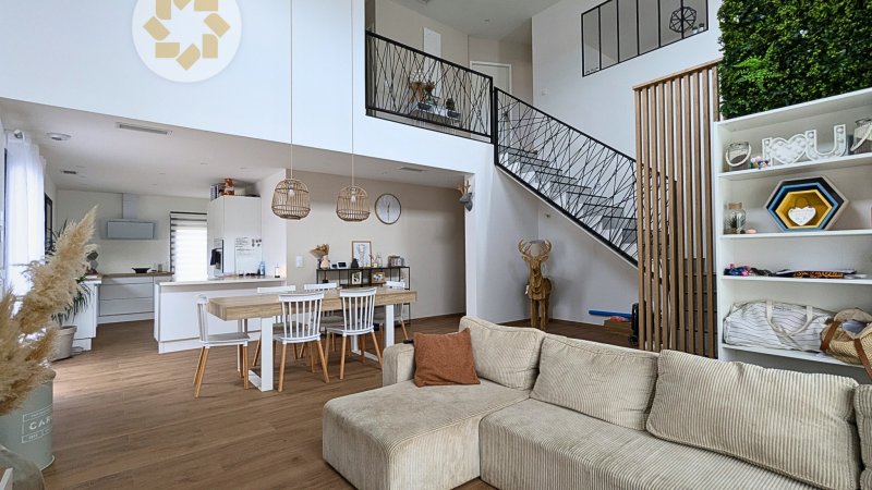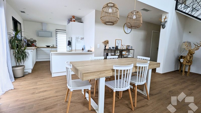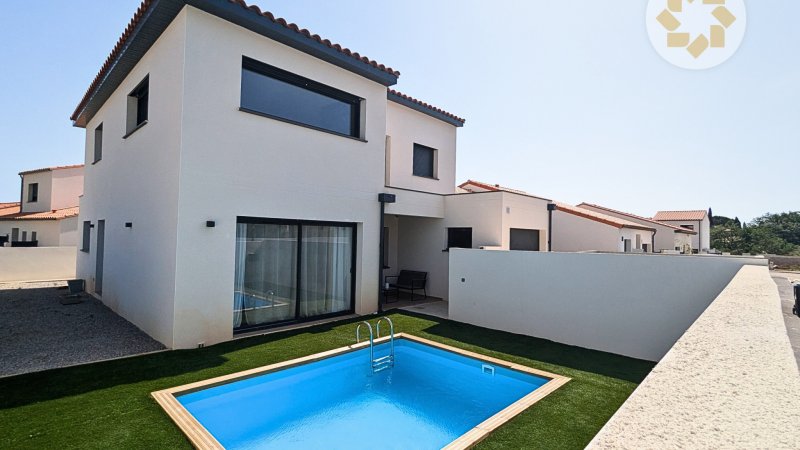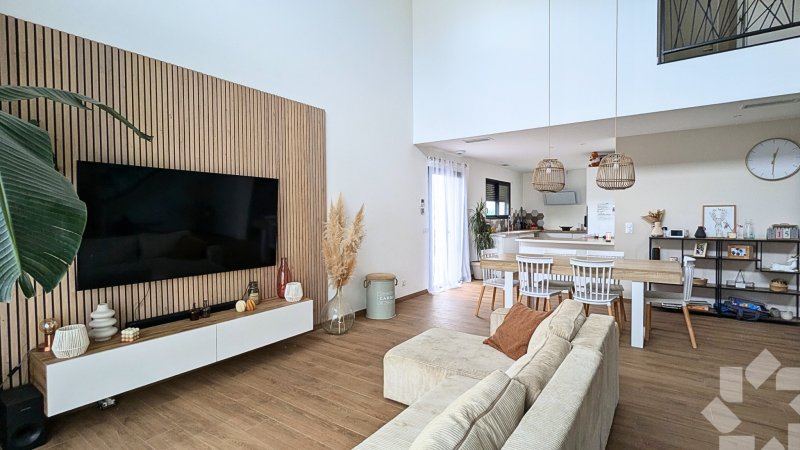 A THUIR (66), VILLA NEUVE, 3 faces, construite en 2025 de 132m2 habitables environ et garage de 14m2, R+1 sur un terrain de 315 m2, Avec suite parentale au RDC. Composée au RDC, d'un grand salon/séjour/cuisine, d'une suite parentale avec dressing et salle d'eau indépendante (meuble deux vasques, douche à l'italienne), d'un WC, d'un cellier avec étagères, d'une buanderie et d'un garage. A l'étage, deux chambres, une salle d'eau, un wc indépendant, et une salle de jeu (pouvant être utilisée en 4ème chambre). A l'extérieur, 2 places de stationnement non closes, terrasse, et une piscine hors-sol enterrée. Menuiseries double vitrage, volets électriques, climatisation réversible gainable air zone, belle cuisine équipée, nombreux rangements, porte de garage sectionnelle motorisés, Chauffe-eau thermodynamique, VMC hygroréglable ... Construite avec des matériaux de qualité, aménagée et décorée avec beaucoup de goût, disposant d'un très beau salon/séjour « cathédrale » avec menuiseries panoramique. Elle répond à la dernière réglementation énergétique et dispose de la meilleure note au DPE. Dans un environnement urbain calme et protégé du vis-à-vis. Cette VILLA est située à moins de 2km du centre ville.
