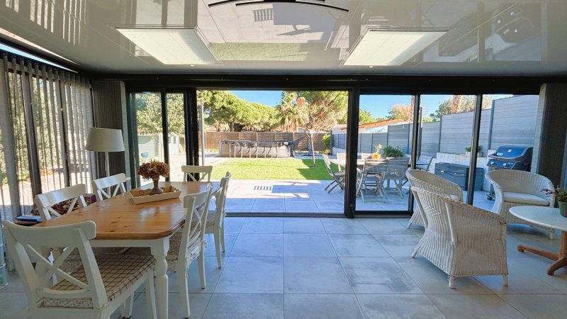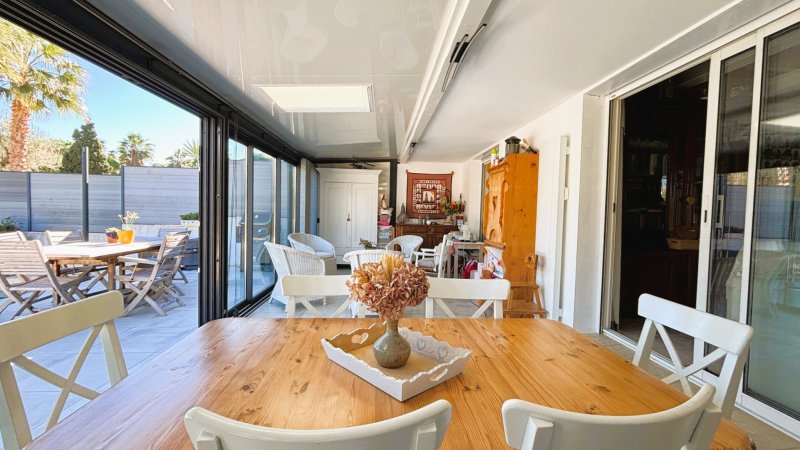 Votre agence TABARY Immobilier vous présente en exclusivité cette charmante villa R+1 en trois faces nichée sur la commune de Torreilles. Érigé sur une vaste parcelle arborée de 690 m2, ce bien offre une surface habitable de 123 m2 avec des espaces généreux et optimisés. Au rez-de-chaussée vous trouverez un espace de vie lumineux et traversant de 38 m2 comprenant un salon séjour et une cuisine entièrement équipée, une chambre spacieuse, une salle d'eau, un WC séparé, une superbe véranda de 26 m2 offrant une vue et un accès direct sur le jardin paysager, et un garage de 18 m2. À l'étage vous disposerez de trois chambres spacieuses et confortables avec placards intégrés dont une bénéficiant d'un solarium privatif, et d'une salle de bain avec WC. Cette villa est équipée de menuiserie double vitrage, de la climatisation réversible, d'un poêle à pellets et de trois places de parking extérieures supplémentaires. Maison familiale par excellence, alliant charme, confort et emplacement privilégié. N'attendez plus et contactez Alexandre TABARY au 06.24.98.31.49 ou par mail sur agence@tabaryimmobilier.com. Les informations sur les risques auxquels ce bien est exposé sont disponibles sur le site Géorisques : www.georisques.gouv.fr.