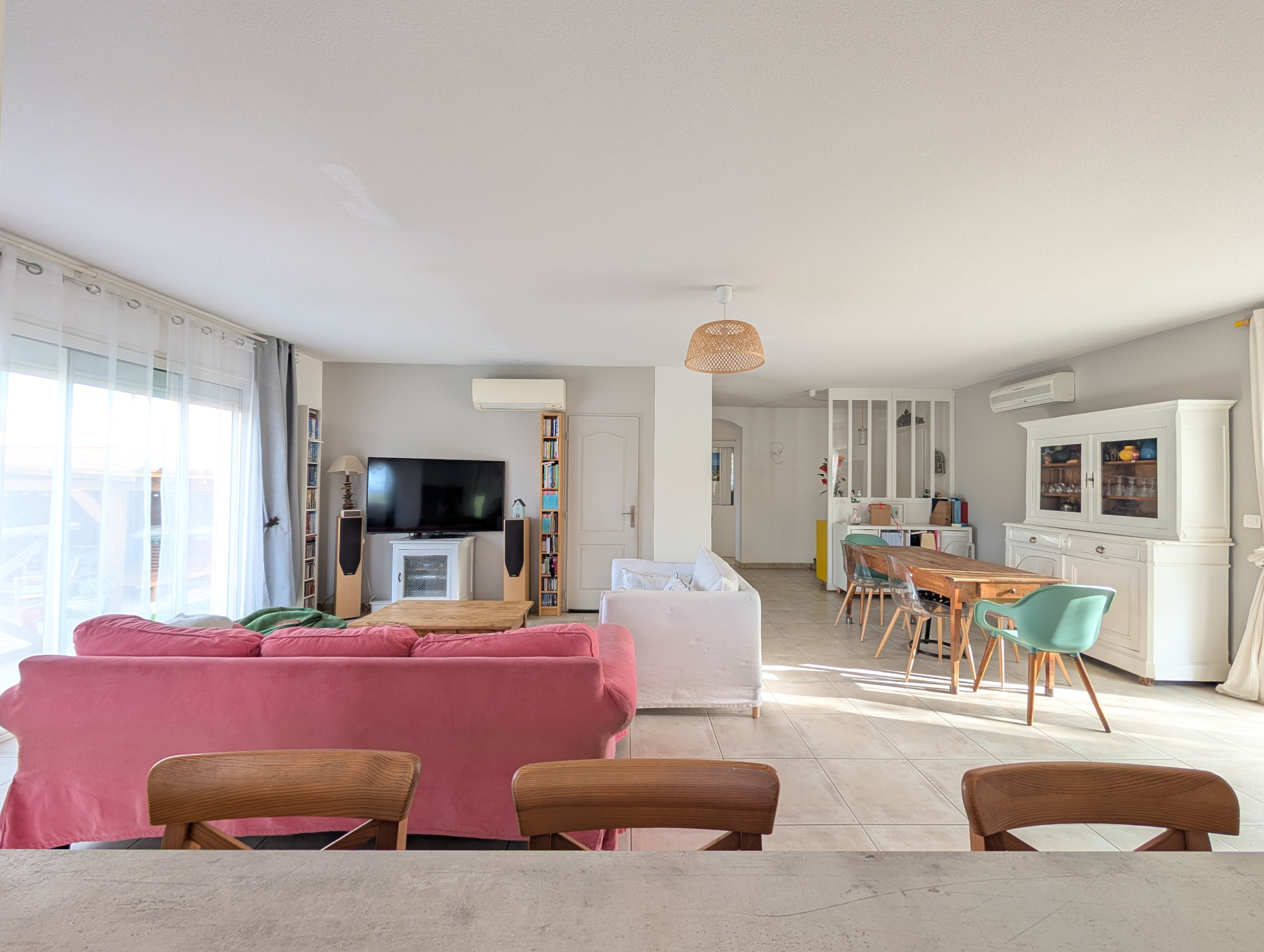 Un vaste séjour traversant avec de grandes baies vitrées donnant sur l’extérieur