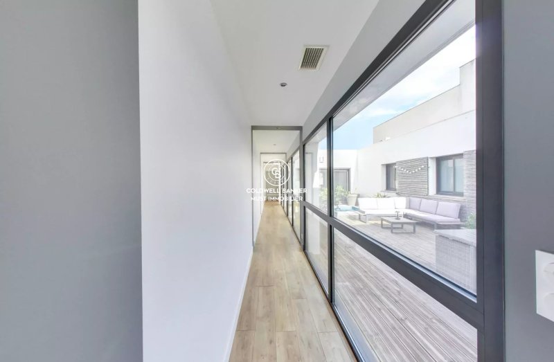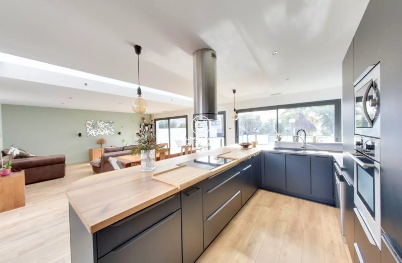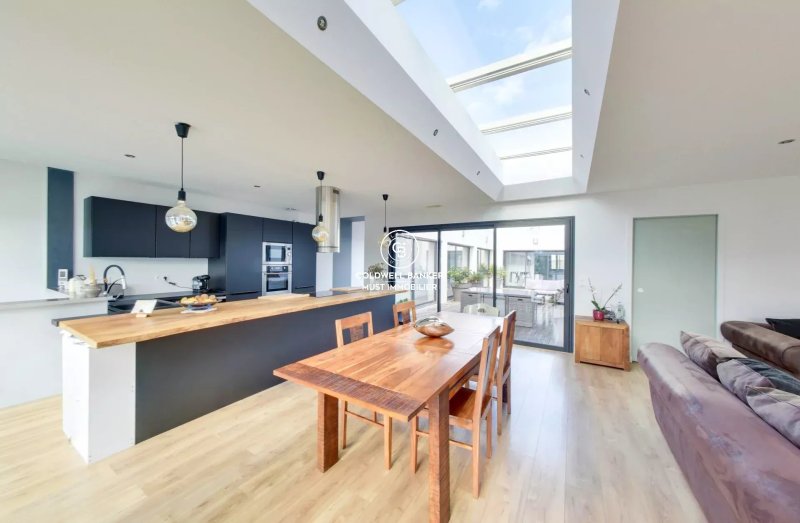 De larges baies vitrées entourent cet espace et baignent les pièces de lumière naturelle tout au long de la journée. Une superbe fenêtre de toit vient sublimer la pièce de vie et la cuisine, apportant encore davantage de clarté et de volume.