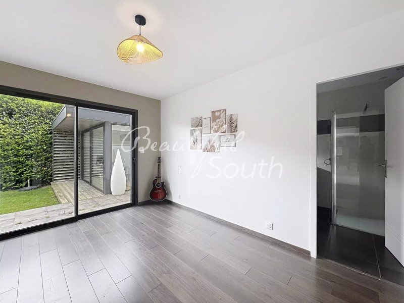 Dès l’entrée, le ton est donné avec un élégant hall qui s’ouvre sur une pièce de vie spectaculaire de plus de 60 m², baignée de lumière naturelle grâce à de larges ouvertures et une baie vitrée à galandage offrant une parfaite continuité entre intérieur et extérieur. Le rez-de-chaussée accueille également une suite parentale raffinée, comprenant chambre, salle de bains et dressing, véritable cocon d’intimité. À l’extérieur, une terrasse sublimée par une pergola bioclimatique invite à savourer des moments privilégiés en toute saison.