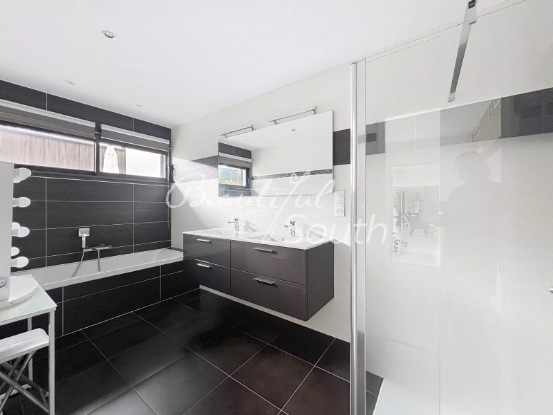 À l’étage, l’espace nuit se compose de trois chambres lumineuses, d’une salle de bains élégante et de WC indépendants. Une vaste terrasse solarium de plus de 21 m² complète ce niveau, idéale pour profiter du climat méditerranéen en toute sérénité.