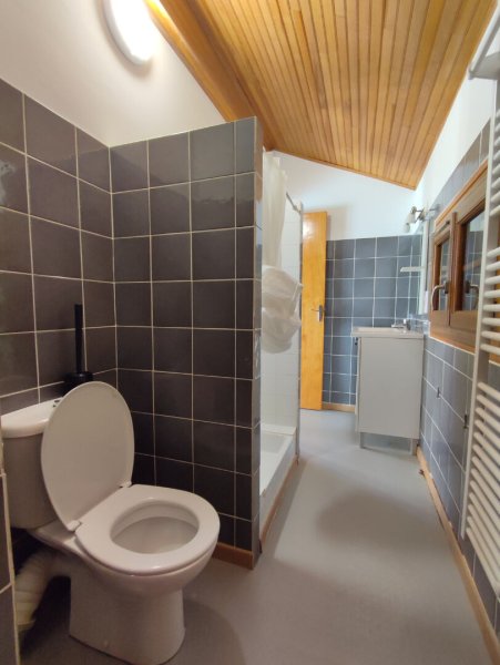La partie principale du chalet se compose d'une cuisine indépendant équipé neuve, une beau séjour lumineux avec cheminée insert et terrasse vue panoramique, une chambre, une salle d'eau avec WC; à l'étage deux chambres, une troisième très spacieuse offrant un accès direct forêt, une seconde salle d'eau avec WC et une buanderie.
