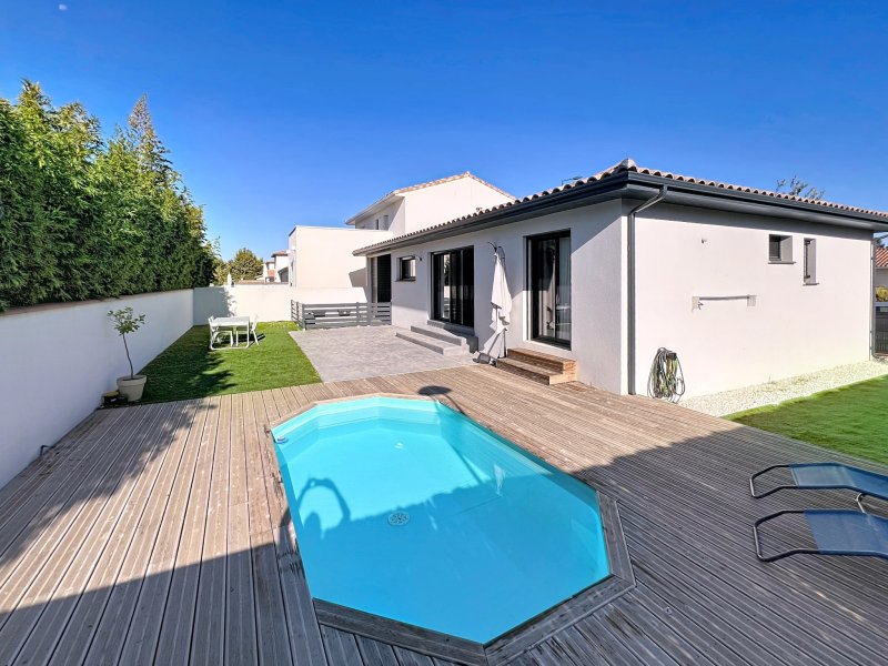 SECTEUR RESIDENTIEL VILLA 3 FACES DE PLAIN PIED ENV 90 M2 SUR 400 M2 DE TERRAIN - PISCINE EN BOIS ENTERREE - CONSTRUCTION DE 2021 SOUS GARANTIE DECENNALE (GROS OEUVRE ET CHARPENTE ) - GARAGE TRAVERSANT CARRELE ET ISOLE - STATIONNEMENT VEHICULE DEVANT GARAGE-PLACARDS RANGEMENT EXTERIEUR ELLE SE DECOMPOSE COMME SUIT : ENTREE -SEJOUR SALON AV CUISINE OUVERTE 42 M2 DONNANT SUR JARDIN ET PISCINE EN BOIS ENTERREE PLEIN -TERRASSE EN BETON MARQUE - 1 SUITE PARENTALE AV DRESSING ET SALLE DEAU DONNANT SUR JARDIN VUE PISCINE - 2 CHAMBRES -SALLE DE BAINS -TOILETTE INDEPENDANT GARAGE TRAVERSANT CARRELE ET ISOLE CLIMATISATION GAINABLE -BALLON THERMODYNAMIQUE - MENUISERIES ALU ET VOLET ROULANT MOTORISE -MOUSTIQUAIRES PROCHE TOUTES COMMODITES LES INFORMATIONS SUR LES RISQUES AUXQUELS CE BIEN EST EXPOSE SONT DISPONIBLES SUR LE SITE GEORISQUES : WWW.GEORISQUES.FR